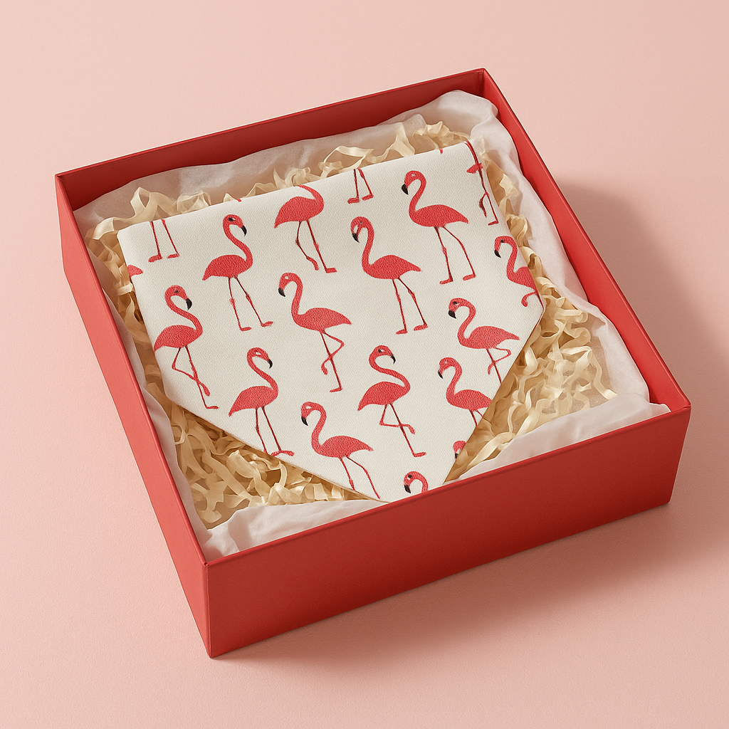 Add a splash of paradise to your pup’s walk! The Flamingo Bandana features cheerful pink flamingos, lush green banana leaves, and a breezy tropical backdrop designed to make every stroll feel like a vacation.